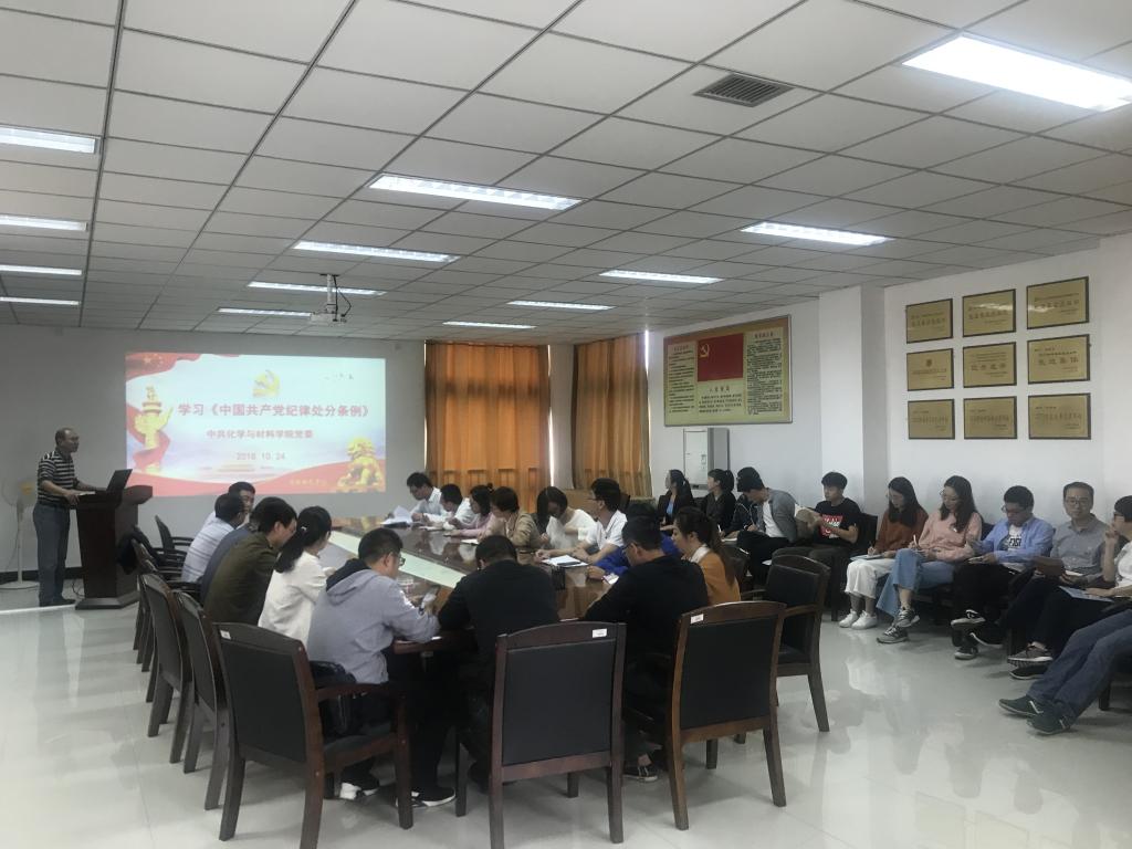 10月24日,化学与材料学院集中学习2018版《中国共产党纪律处分条例》,全院党员干部参加会议。会议由院党委书记游东宏主持。