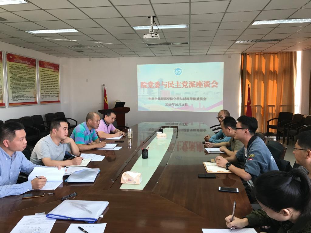 新中国成立70周年,也正是多党合作和政治协商制度确立70周年重要时间节点,2019年10月16日下午,中共化学与材料学院党委与学院民主党派人士围绕“不忘初心、牢记使命”主题教育,开展了“不忘合作初心,继续携手前进”的谈心谈话。化学与材料学院党委书记游东宏、副书记应少明、宣传委员雷永汉、纪检委员叶陈清组织民盟、民革、民进党的成员认真学习贯彻习近平总书记关于多党合作的重要论述,就切实加强中国特色社会主义参政党建设等情况,深入落实“不忘初心,牢记使命”主题教育在为民办实事办好事具体内容和细节问题上开展了谈心谈话。