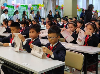 小朋友们在用报纸折出纸制垃圾桶