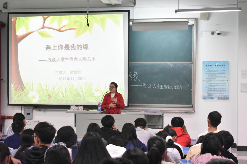 11月28日,校心理健康教育中心主任欧嘉烟老师做客我院,在CC401开展了题为”遇上你是我的缘——浅谈大学生宿舍人际关系”的讲座。学工办陈思企老师、各宿舍舍长以及18级全体班委参加本次讲座,讲座由陈思企老师主持。