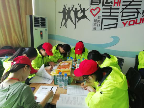 在志愿服务中,利用短暂的休息时间,同学们不忘本分,争分夺秒的学习。