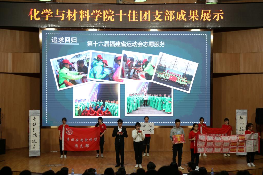 16级环境科学与工程班“绿水青山型”团支部以歌唱、展示环保手工艺品的形式,展现了自己的风采,传播了绿色能量,拉开了活动的帷幕。17级应用化学一班“知书达理型”团支部以“继礼仪之风,扬中华风采”为口号,展现自身特色;16级化学班“争做合格教师型”团支部不忘初心,向观众展示了他们为成为“合格教师”所做的努力;17级环境工程与科学班闽南文化型团支部以一段生动的情景剧开场,又深入地从“品味闽南”、“感悟闽南”、“弘扬闽南”三个方面带观众们领略闽南文化的风采;17级应用化学二班“知识探究型”团支部用有趣的情景剧和《化合价之歌》展示了他们对知识的探索;17材料化学一班“极创意设计型”团支部展示了如特色班徽、创意黏土等别具新意的作品,争做新时代创意青年;17材料化学二班“材系真情型”团支部,为我们真情演绎了何谓同学情,何谓师生情,结尾更是用惊艳的影子舞展示了感人的亲情。本次十佳团支部成果展示会在观众的掌声中圆满谢幕。每个支部建设的精彩展示体现了学子们积极向上、奋勇拼搏的优秀品质,也为未来团支部的建设打下了良好的基础。