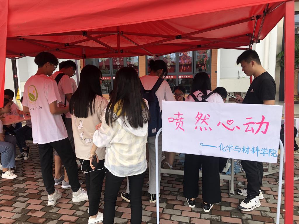 为了促进学生心理健康,营造校园良好心理氛围。宣传心理健康知识,提高学生心理自助能力,增强学生心理保健和求助意识。学生发展与服务中心和化学与材料学院合办开展的“‘喷’然心动”活动于5月19日下午在新食堂门口如期举行,该活动是2019年心理健康月系列活动之一。