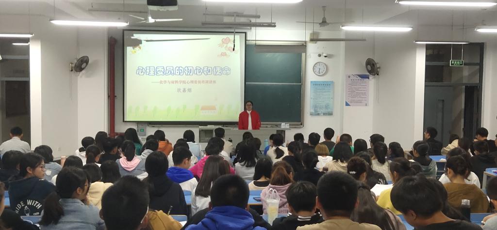 为更加及时有效地帮助同学们掌握排解心理问题的技巧和方法,2019年11月25日,化学与材料学院在求实楼C401举办心理委员培训讲座。欧嘉烟担任本次讲座主讲人。参加本次讲座的有辅导员王松、化学与材料学院17、18和19级全体心理委员以及宿舍心理联络员。
