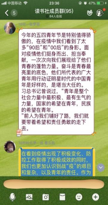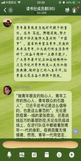 “我们不曾见过枪林弹雨、血染山河,但我们遭遇了疫情,一场无硝烟的战争,正如校训‘使命、责任、追求’所言,我们这一代青年也应当承担起属于我们的责任、使命。我们应该在‘爱国、励志、求真、务实’上做更多的努力,要有所作为。”社员张梦菲分享说。活动期间,社员们认真学习了近年来习近平总书记的五四寄语,积极分享自己的学习心得,共同传承五四精神。