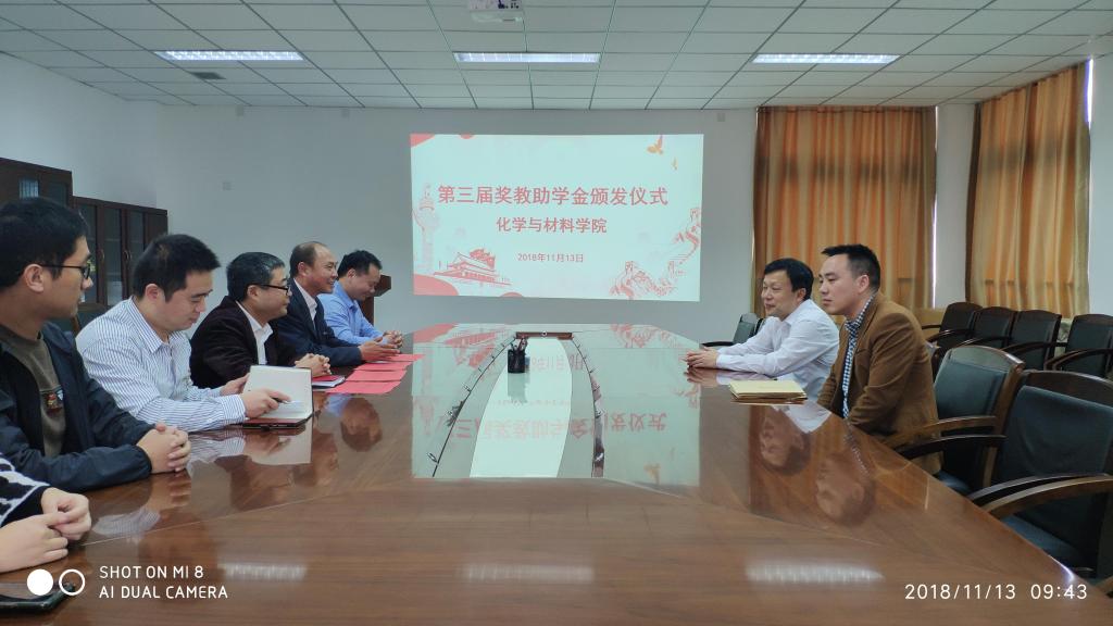 11月13日上午,在化学与材学院会议室举行了第三届“奖教助学基金”颁奖仪式。副校长颜桂炀、院党委书记游东宏、副院长应少明、陈峰等部分学院教师和学生代表出席大会,大会由游东宏书记主持。
