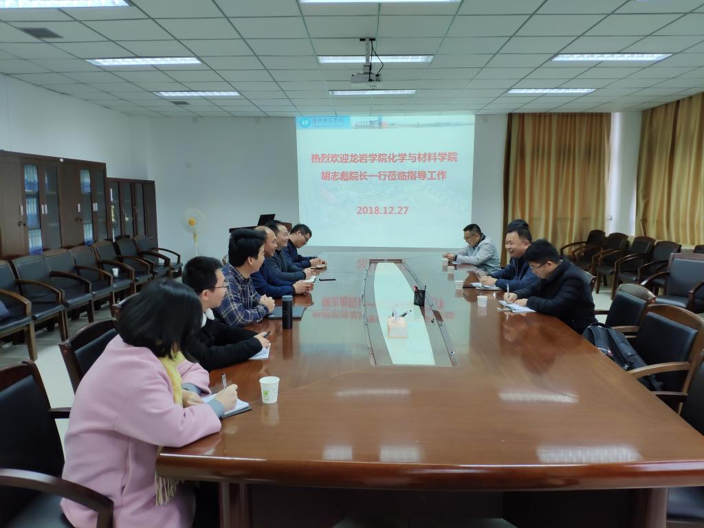 2018年12月12月27日,龙岩学院化学与材料学院院长胡志彪教授一行四人莅临我院交流讲学。胡志彪教授一行实地考察了我院各实验室和科研平台的建设情况,并在学院会议室进行座谈。我院党委书记游东宏、院长应少明、院长助理谢丹华副教授、实验室主任叶陈清博士,以及各系主任、副主任参加了本次座谈会。座谈会上,大家共同回顾了两院交流的悠久历史,肯定了两院长期以来相互合作的关系,对两院未来进一步深入交流表示期待。随后,胡志彪教授一行审阅了材料化学系各专业的人才培养方案,并提出了宝贵的意见和建议。