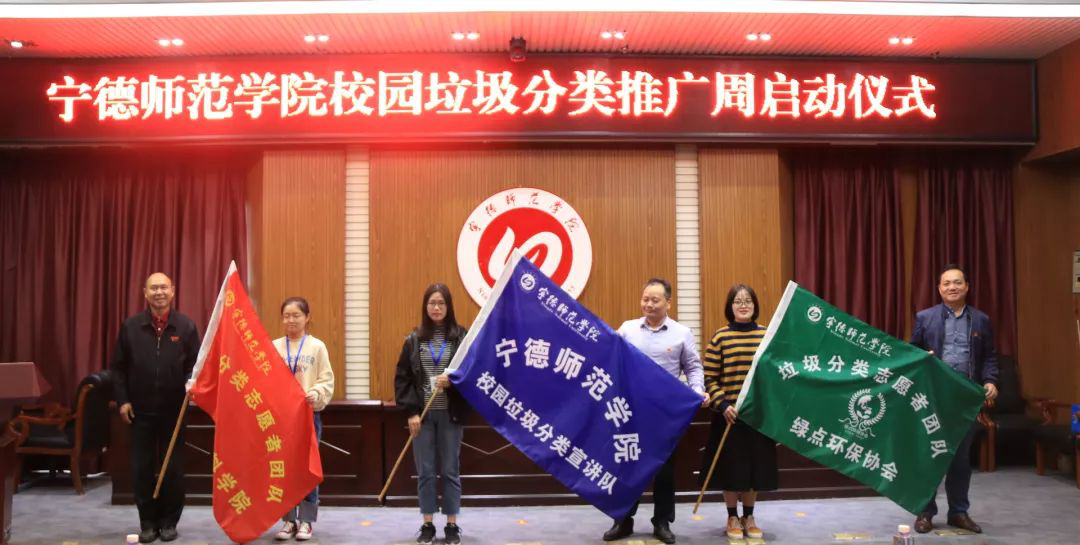 在启动仪式上,化学与材料学院游东宏书记、化学与材料学院应少明院长、校团委张秋良副书记为垃圾分类志愿者团队、校园垃圾分类宣讲队、绿点环保协会垃圾分类志愿者团队授旗。
