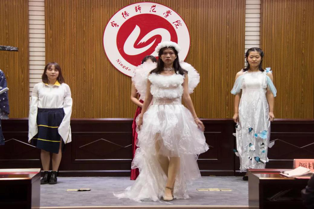 志愿者还将可回收垃圾制作成了环保手工艺品和服装,以走秀的方式为观众展示。