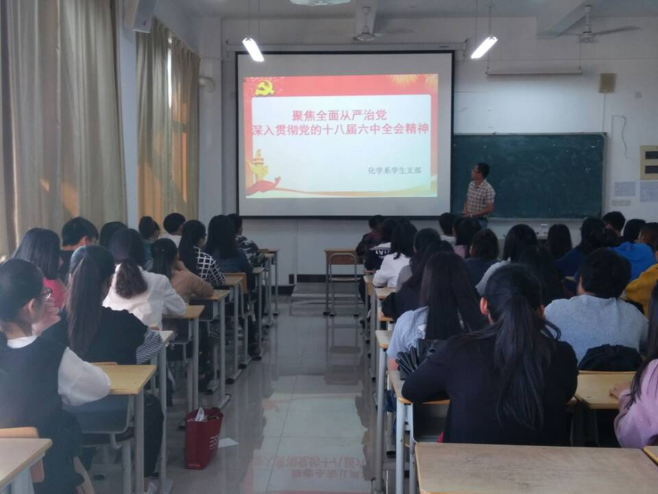 2016年11月7日化学系学生党支部在CC402召开全体党员和积极分子学习十八届六中全会精神。学生支部书记王昌雷老师以“夯实从严治党基石,坚持不忘初心跟党走”为题,从十八届六中全会公报、把握12个“关键词”、学习十八届六中全会精神的体会等三个方面介绍了十八届六中全会的主要内容,解读了十八届六中全会的主要精神。王昌雷强调,一个主题即“全面从严治党”和两个明确即明确习近平总书记是党中央的核心、全党的核心;同时要注意把握全面从严治党、领导核心、党内政治生活、党内监督、纪律严明、党内民主、反对腐败、高级干部、权力监督、群众路线、民主集中制、选人用人等12个“关键词”。