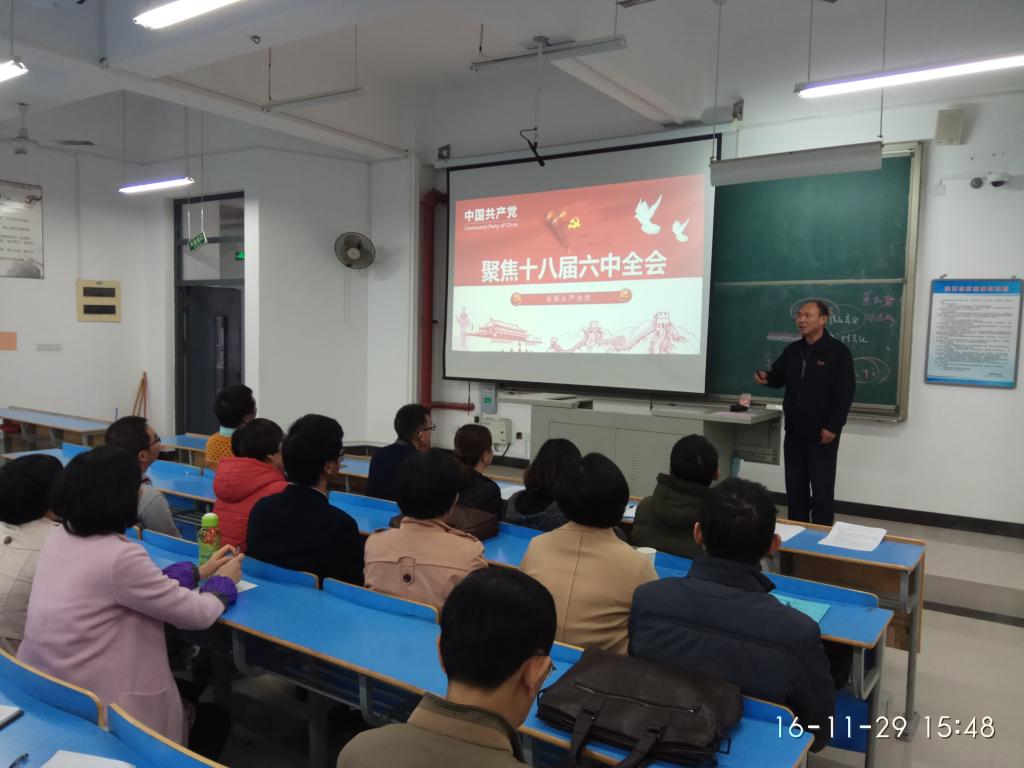 2016年11月29日,化学系党总支书记游东宏在化学系C401室召开题为《聚焦十八届六中全会》的专题党课。化学系全体教师参加了学习。