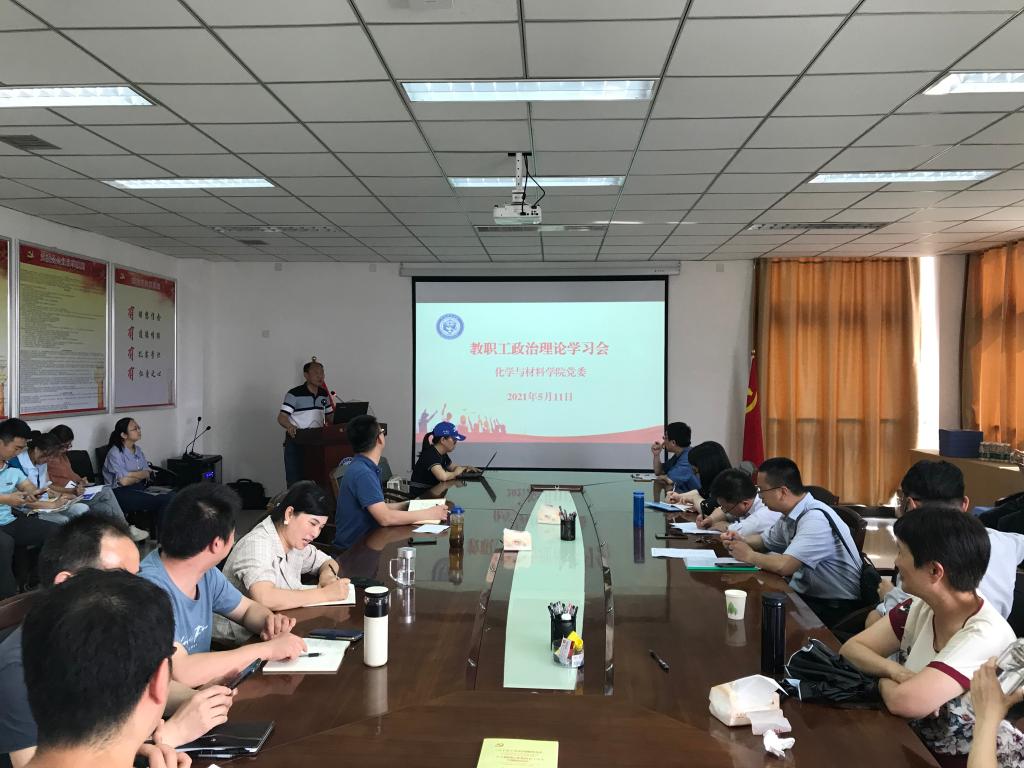 5月11日,为扎实推进党史学习教育,院党委在CD401会议室召开教职工第6次政治理论学习会,专题学习中国共产党人的精神谱系之一“红船精神”,会议由学院党委书记游东宏主持。化学与材料学院全体教职工出席会议。