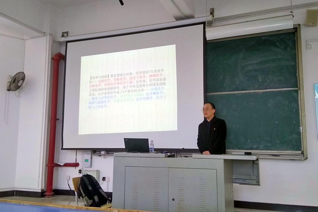 2017年12月4日下午,北京大学化学与分子工程学院刘剑教授在求实楼CC401报告厅为化学与材料学院师生举办了一场题为《今日化学之理论和计算化学》的讲座。讲座由化学与材料学院党委书记游东宏主持。参加讲座的有化学与材料学院副院长应少明与相关专业师生共一百多名。