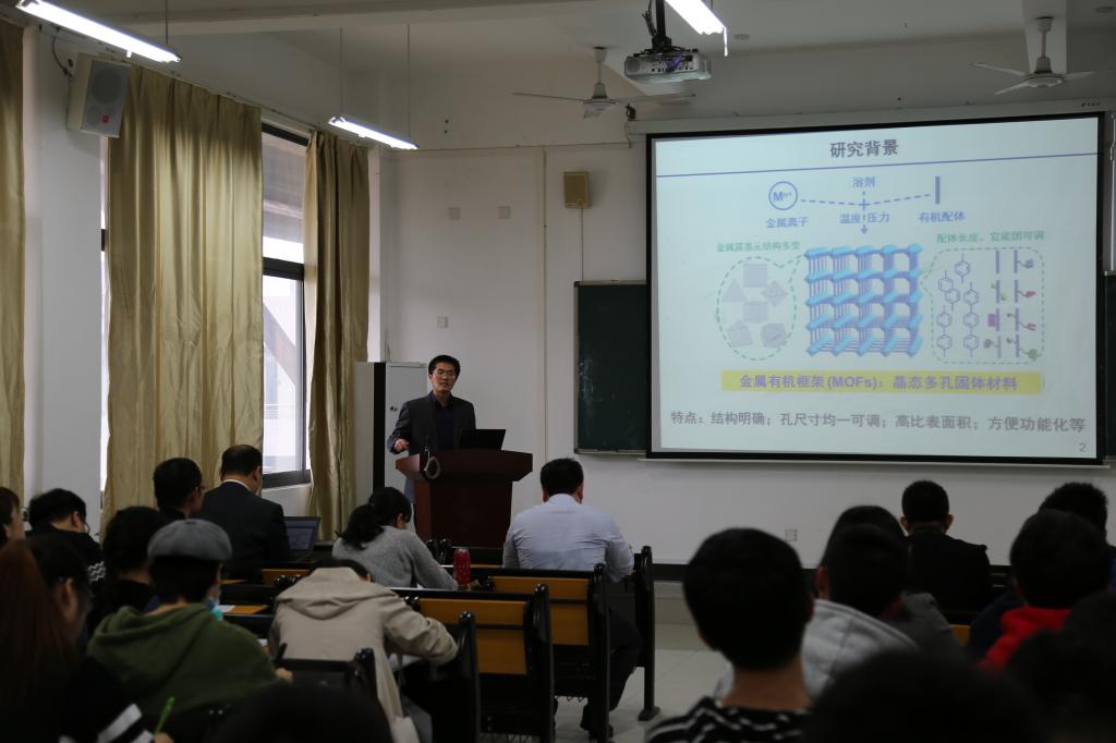 2017年11月29日上午,中国科技大学江海龙教授在求实楼CC402报告厅为化学与材料学院师生举办了一场题为《金属有机框架的催化功能化》的讲座。讲座由化学与材料学院副院长应少明主持。参加讲座的有应用化学专业以及材料化学专业教师、15级应用化学专业学生共七十余名。