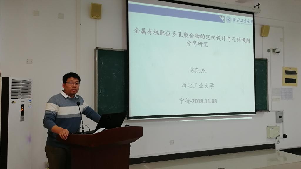 2018年11月8日下午,西北工业大学陈凯杰教授在求实楼CC402报告厅为化学与材料学院师生举办了一场题为《金属有机配位多孔聚合物的定向设计与气体吸附分离研究》的讲座。讲座由化学与材料学院副院长应少明主持。参加讲座的有化学与材料学院师生共八十余名。