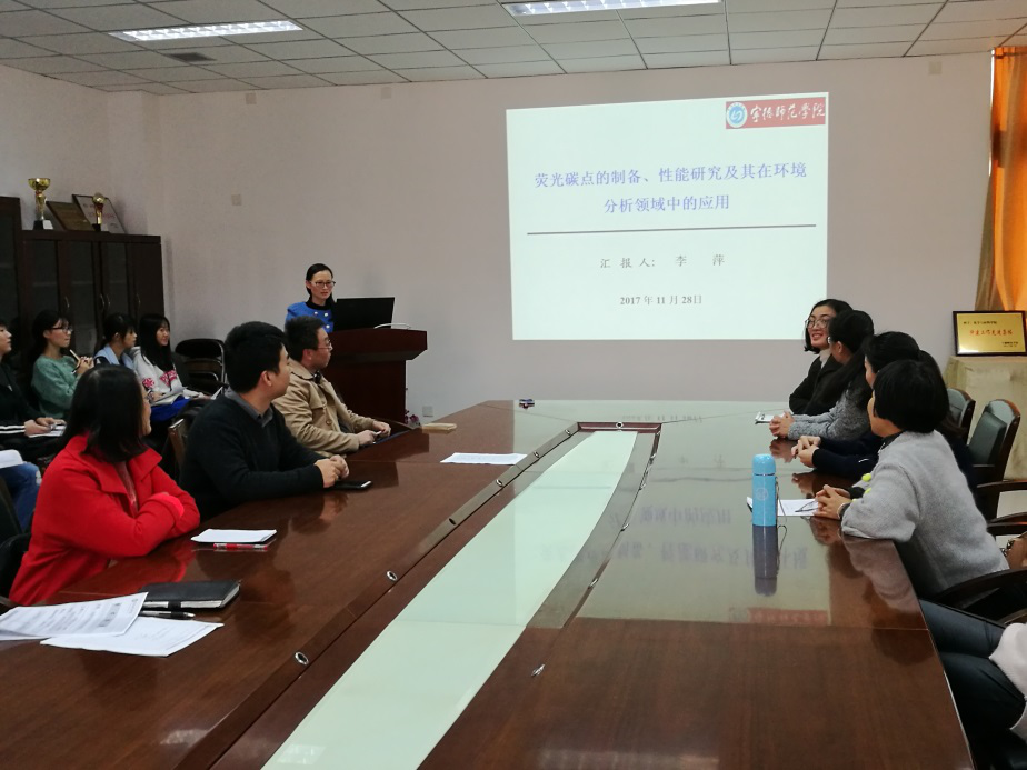 李萍博士结合自己博士期间所进行的研究工作,介绍了碳点的发光性能、催化性能的研究,并将碳点应用于生物分子、环境污染物的分析检测,揭示了构建光化学传感体系的作用机理。黄仁昆博士详细讲述了目前MOFs材料在光还原CO2研究背景、目前研究现状和研究前景。并以此为基础,同在场老师分享了申报国家基金的灵感来源和一些心得体会。在自由提问环境,学院老师就各自感兴趣的内容分别与两位博士进行了交流与探讨。