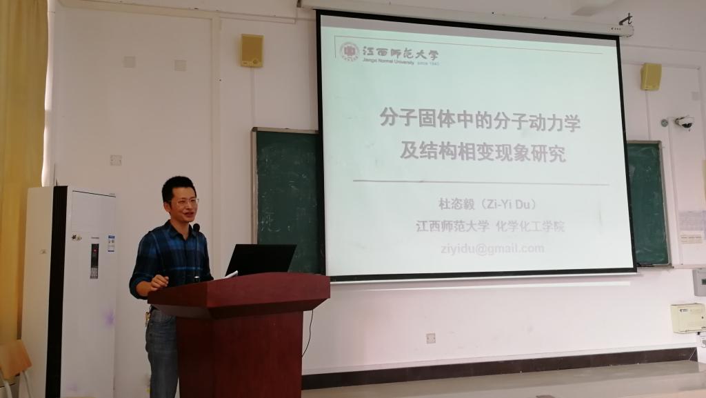 2018年11月8日上午,江西师范大学杜恣毅教授在求实楼CC402报告厅为化学与材料学院师生举办了一场题为《分子固体中的分子动力学及结构相变现象研究》的讲座。讲座由化学与材料学院副院长应少明主持。参加讲座的有化学与材料学院师生共八十余名。