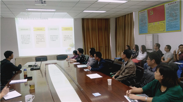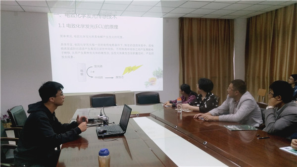 10月11日下午,周晨博士在求实楼化学系会议室(CD401),为我系的“科研沙龙”活动做了第二场学术报告,题目为《新型纳米材料的电致化学发光传感应用》,活动由化学系主任助理陈峰主持。周老师结合自己博士期间所进行的研究工作,从电致化学发光的原理和特性、电致化学发光传感的发展历史、新型电致化学发光材料的合成及传感应用等多个方面向师生们作了系统、详细的讲解。在讲座的自由交流环节,周博士还就新型纳米材料的研究、纳米材料表征样品的制备、电致化学发光传感、相关生化传感器在实际环境中的应用等各自感兴趣的话题与我系师生进行了互动和分享。
