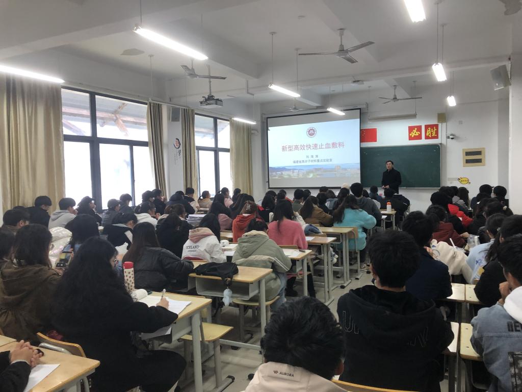 刘海清教授从外伤流血及后果、欧美止血材料的发展历史、止血材料的价格、课题组研究的天然多糖基止血敷料四个方面进行介绍。报告结束后,同学们就感兴趣的问题与刘教授进行交流。