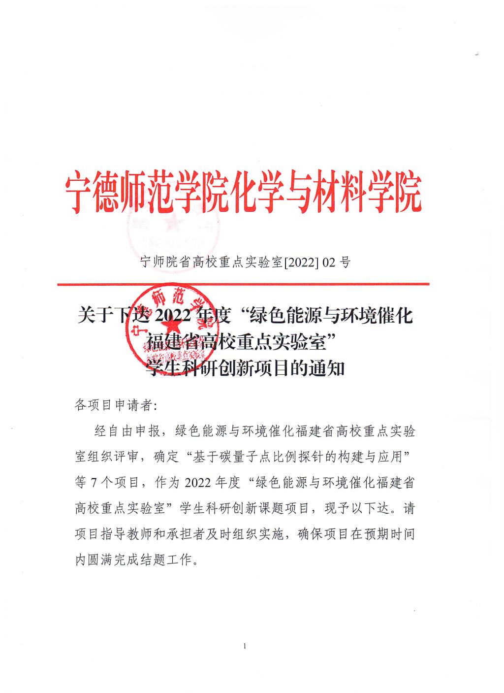 关于下达2022年度”绿色能源与环境催化福建省高校重点实验室“学生科研创新项目的通知