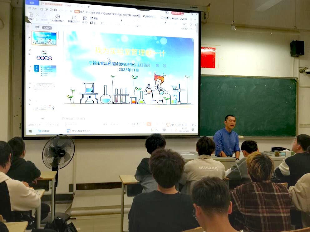 2023年11月10日下午,宁德市食品药品检验检测中心主任药师黄颂应邀为我院22级应用化学(闽台)班、23级环工班和部分有意愿的同学在CC404开设了题为“如何成为一个好的分析试验员”的讲座。