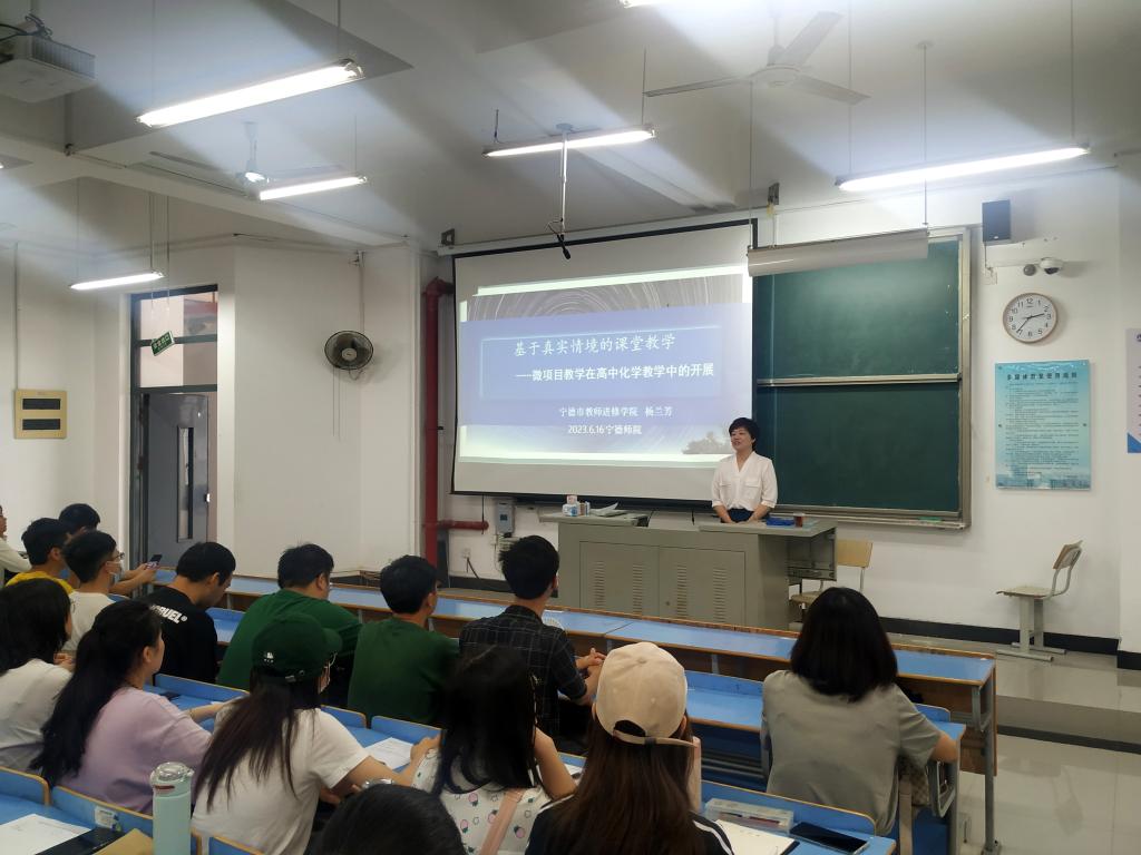 2023年6月16日,应学院邀请,宁德市教师进修学院高中化学教研员杨兰芳老师为化学专业师生开设题为《基于真实情境的课堂教学——微项目学习在高中化学教学中的开展》学术讲座。