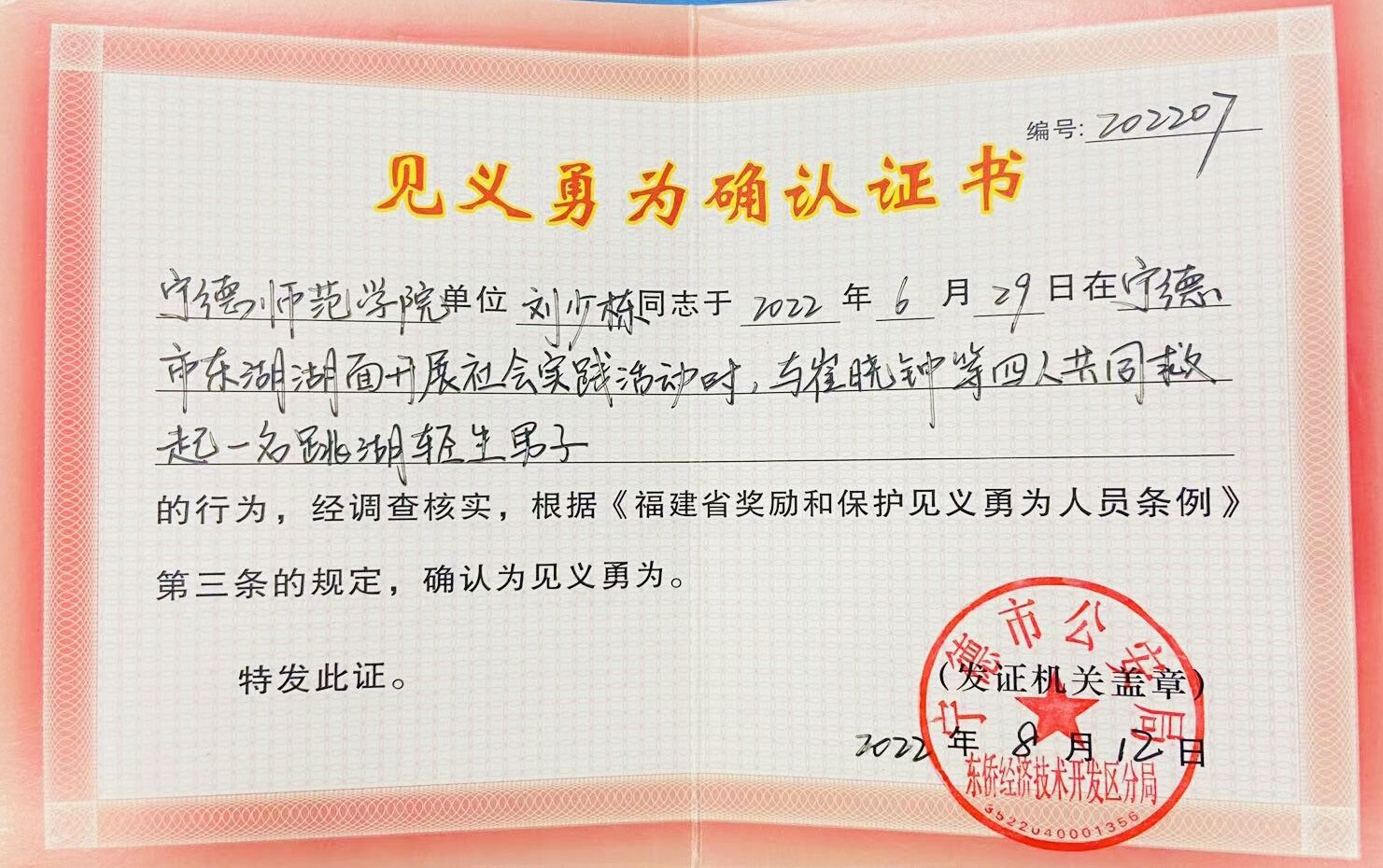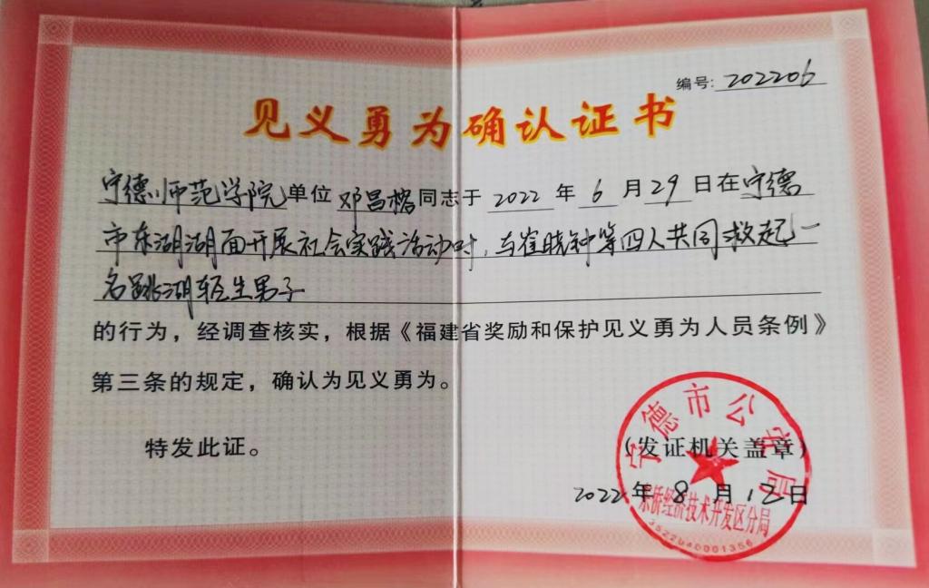 在巡湖活动过程中,我院2020级化学专业邓昌榕、2021级冶金专业刘少栋与其他3名同志发现一名跳湖溺水者。他们分工明确、配合默契,迅速对溺水者展开营救,将落水者拉到救援船上,合力对他进行吐水急救,成功挽救了轻生者生命。宁德市公安局东侨分局经调查核实,为邓昌榕、刘少栋等5位同志颁发了“见义勇为确认证书”。